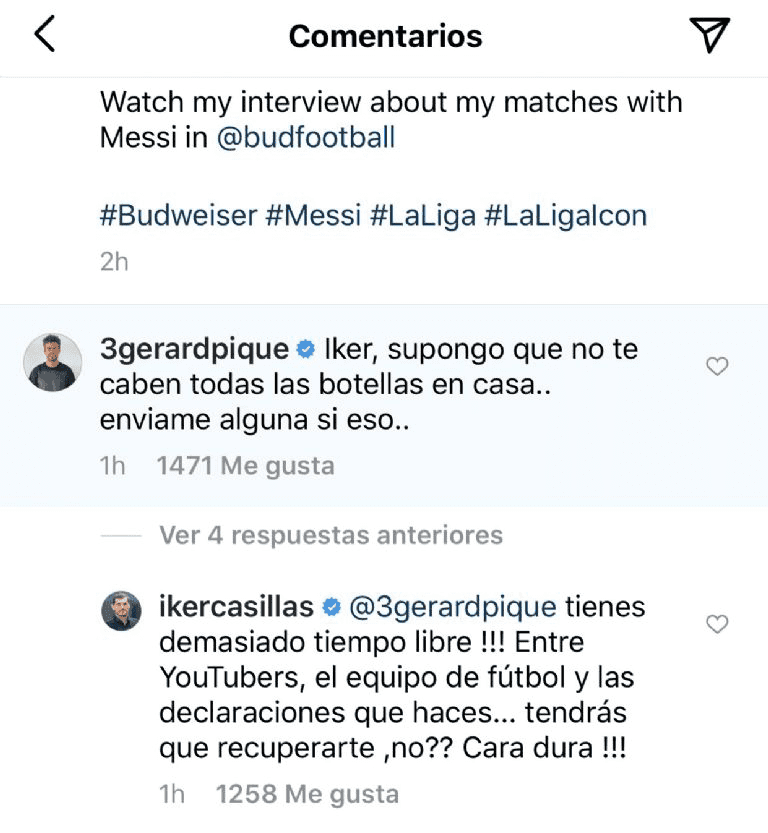 Piqué appeared in the post made on Instagram with a very hard comment, saying that he could give Casillas a hand to carry so many bottles, making fun for the number of goals he received from Messi. The goalkeeper did not take the joke in a good mood and told Piqué that he had a lot of time free nowadays and that he was talking too much.