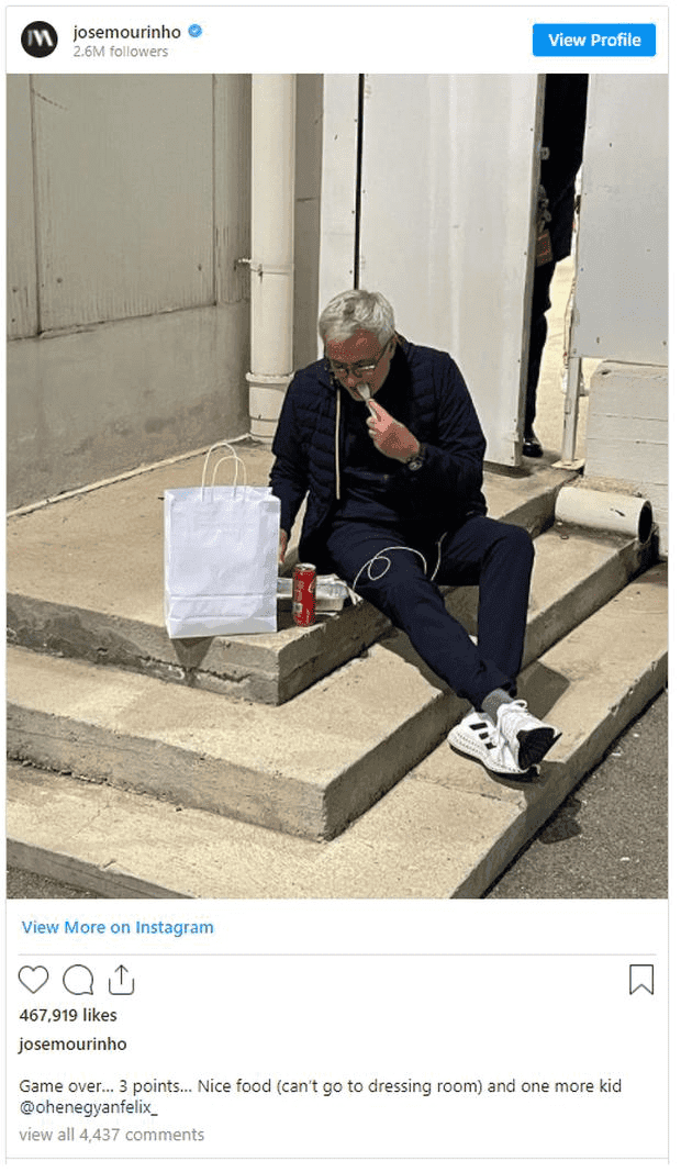 The photo has gone viral in a matter of hours, as it bears José Mourinho's stamp everywhere. After the victory of Roma visiting Cagliari, the Portuguese coach shared an image on his Instagram account, in which he appears having dinner in no less than the stands of the Arena Sardinia stadium, as he could not even enter the changing rooms, as he was serving his suspension for having been sent off against Napoli.