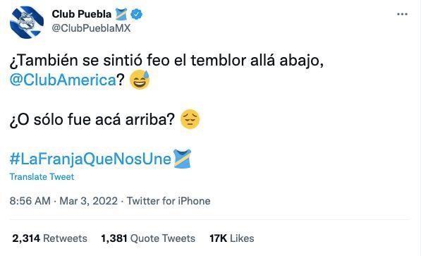 Using his Twitter account, Puebla's community manager wrote: "Did the tremor feel ugly down there too @ClubAmerica ? Or was it just up here?".