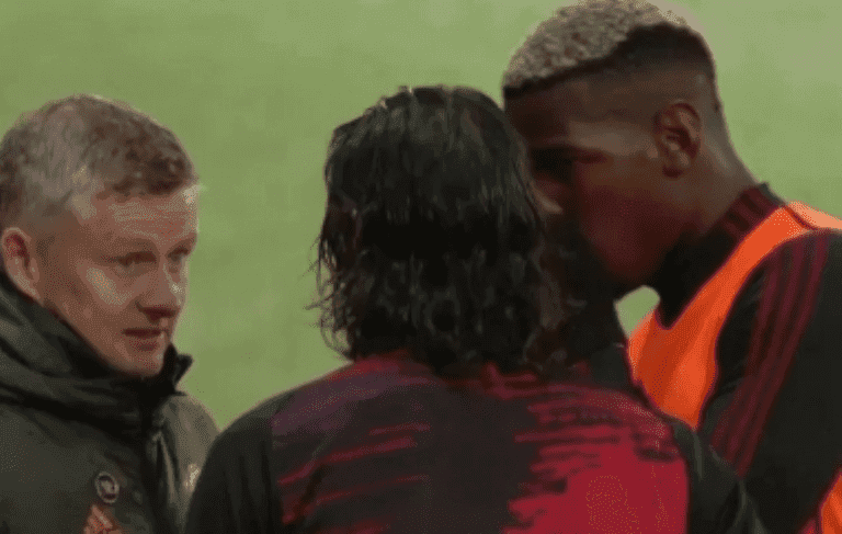 But, before jumping to the pitch the TV cameras captured an incredible image. As Cavani doesn't speak in English and head coach Ole Gunnar Solskjaer doesn't speak in Spanish they called Paul Pogba to translate the indications from the trainer to the player.