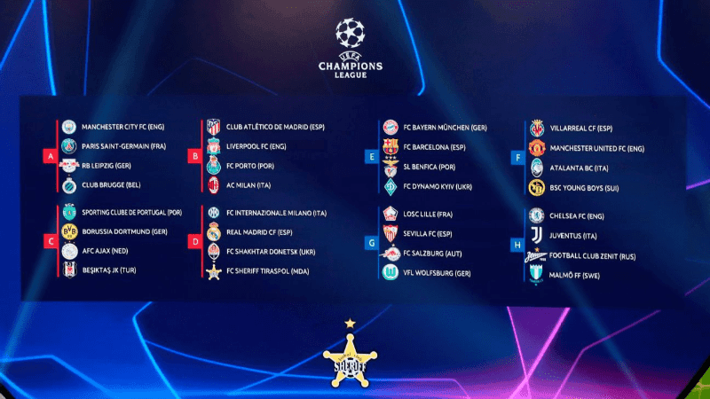 - Group A: Manchester City (England), Paris Saint Germain (France), RB Leipzig (Germany), and Brugge (Belgium).