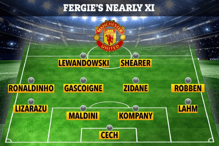 To start, we have Petr Cech as a goalkeeper. The defenders were Philippe Lahm, Vincent Kompany, Paolo Maldini and Bixente Lizarazu. The midfielders of that possible XI were Arjen Robben, Zinedine Zidane, Paul Gascoine and Ronaldinho. In attack, Roberto Lewandowski and Alan Shearer. A top team that never played together but that Ferguson was near to unite.