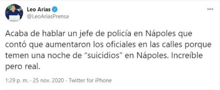 According to a qualified journalist from Argentina, the Naples police increased their security as they fear that there will be a night with many suicides. According to journalist Leonardo Arias, the Naples police chief came out to speak and said that they added more police officers than normal because people can make drastic decisions after learning of Diego Maradona's death.