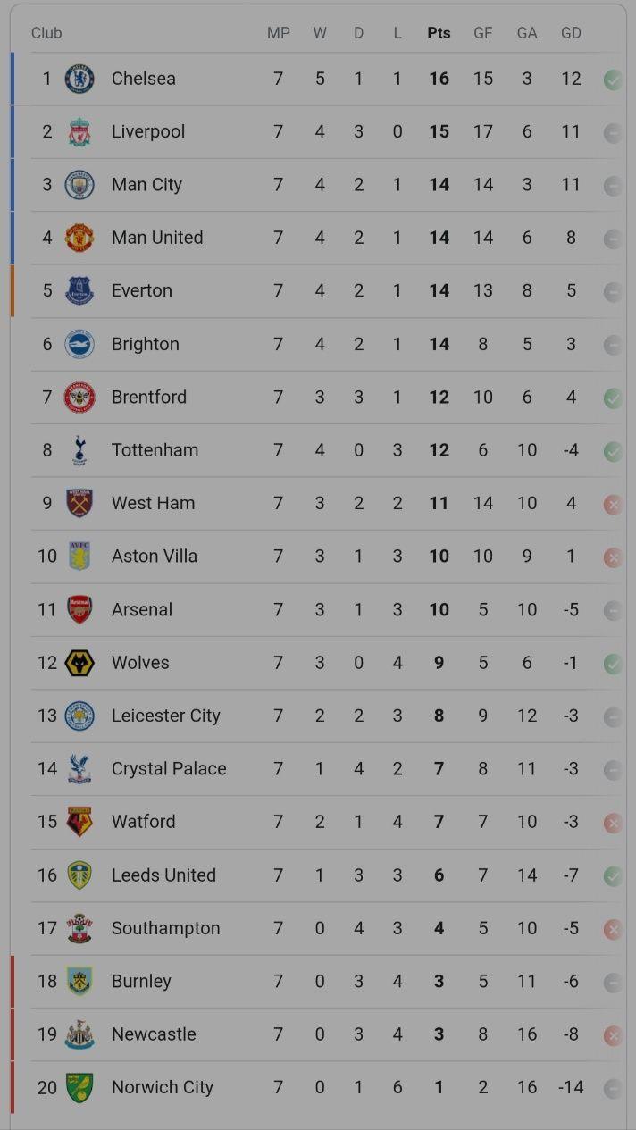 Chelsea are currently top of the table after a nervy 3-1 win over Southampton with 16 points from a seven games, they have won five of their games, drew one with Liverpool and lost the other one to Manchester City. They are yet to concede an open play goal as the three goals they have conceded have come from penalties and corner kicks.