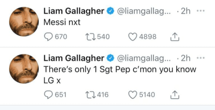 Liam Gallagher is one of Manchester City's most famous fans and that is why he has a lot of influence in decisions and in the dressing room. The Oasis singer is always very close to the players and often comes in to greet them before or after the game. After confirmation that Guardiola was continuing, Gallagher tweeted to talk about Lionel Messi.