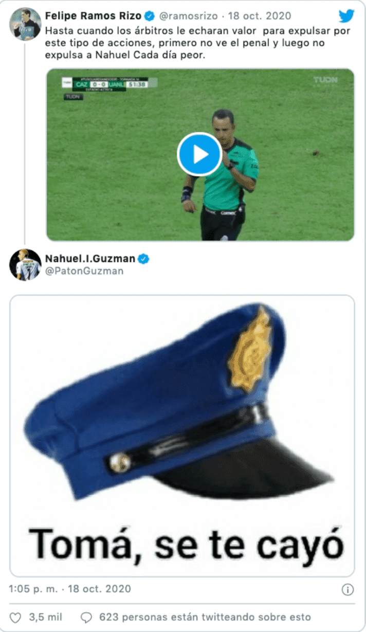 The response from the former goalkeeper of the Club Atlético Newell's Old Boys of Argentina came via Twitter to Ramos Rizo. Guzmán, who has also played for the Argentinian national team, published a police hat, an expression that the Argentine citizens use to refer to people that expose someone else without having any relation with the situation or been directly affected by it. In other words, Guzmán called Ramos Rizo "a snitch".