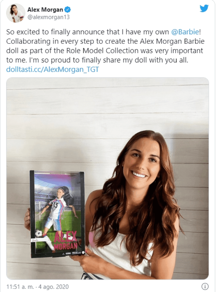 The announcement is the creation of an action figure, specifically a barbie, made in the image of Alex Morgan. The two-time Women's World Cup winner joins the exclusive roster of soccer players who have action figures based on them, such as Lionel Messi and Cristiano Ronaldo.