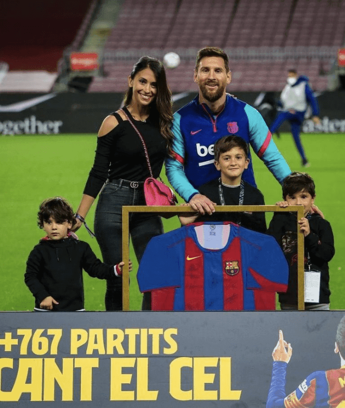Messi received a signed framed shirt and posed with the entire squad behind a poster with his figure and the record achieved. Then it was the turn of a family photo, with Antonela Roccuzzo and her three children, who burst onto the playing field and were also portrayed.