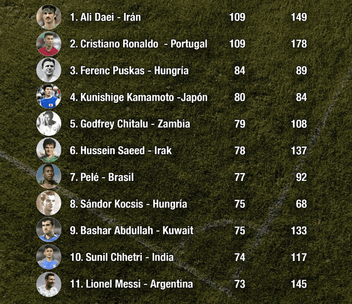With this number of goals, Ronaldo climbs to first place and, still with a margin of time in his favor, could escape even more from his immediate pursuers to continue increasing his numbers. With 109 goals in 178 games, CR7 equaled former footballer Daei (with the same number at 149), who retired in 2006 (he was the captain of Iran at the World Cup that year). Behind and up to ninth place appear names of players who have already retired such as Ferenc Puskas (3rd with 84) or Pelé (7th with 77). Those who continue in the race, but still far from that figure, are the Indian Sunil Chhetri (74 goals in 117 games) and the Argentine Lionel Messi (73 goals in 145 games).