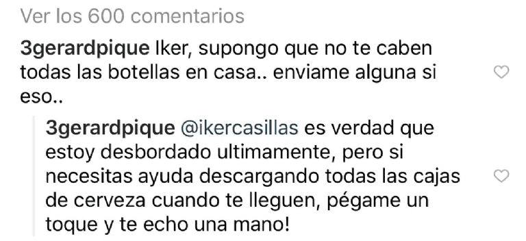 Piqué appeared in the post made on Instagram with a very hard comment, saying that he could give Casillas a hand to carry so many bottles, making fun for the number of goals he received from Messi. The goalkeeper did not take the joke in a good mood and told Piqué that he had a lot of time free nowadays and that he was talking too much.