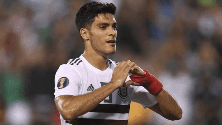 Raúl Jiménez in action wearing the Mexican shirt.