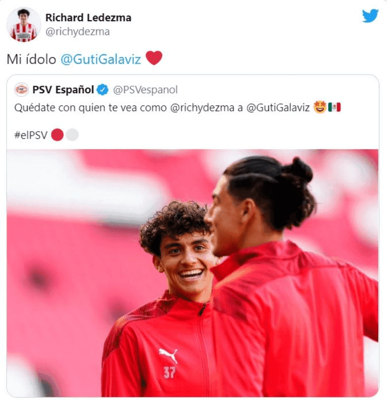 In a photograph that the spanish account of PSV showed, Ledezma and Gutierrez are laughing. That publication was titled by the PSV account as: "Stay with someone that stares at you like Ledezma stares at Gutierrez". The tweet post was retweeted by Ledezma who declared fan of Gutierrez. "My idol", expressed the Mexican American player.
