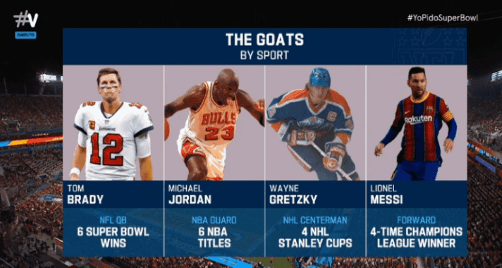 The official TV broadcast showed an overlay graph with the four legends, referring to them as ‘The four GOATs’. They mentioned Brady’s Super Bowls (six, since it was shown before the match started), Michael Jordan, with six NBA titles, Wayne Gretzky, with four NHL Stanley Cups and Lionel Messi, who has won four UEFA Champions League titles.