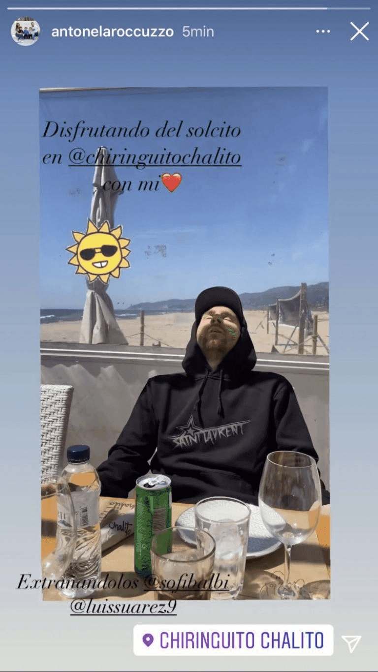 "Enjoying the sun at Chiringuito Chalito with my heart (not the word, but the emoji)", was the message that Antonela shared in an Instagram storie making a brief pan of her view with the sand, water and a Messi ready to taste some of your favorite dishes at the Castelldefells beach bar.