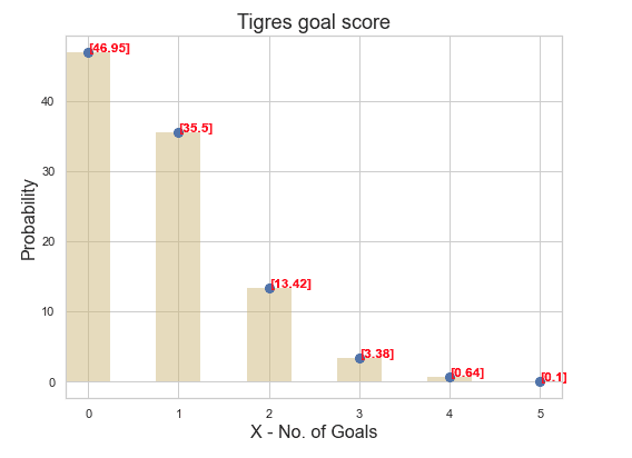 Rebaño Sagrado has a 33.63% probability of scoring two goals or more, so the chances of scoring a big difference against Tigres are slim.