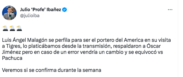 TUDN journalist Julio Ibañez announced that Luis Malagón did the training with the starters and Óscar Jiménez was sent with the substitutes. Coach Fernando Ortíz will make changes to his team to face the Tigres.
