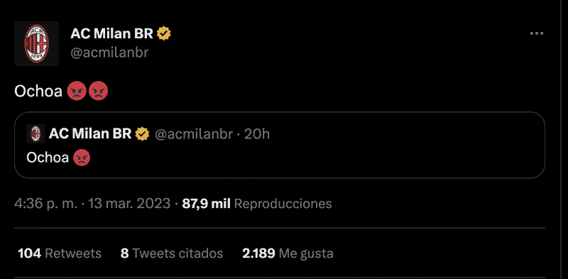 Through social networks, the official account of AC Milan, in Brazil, exposed his opinion on this particular play and on what he thinks of Guillermo Ochoa. An emoji with the expression of annoyance was what made the account, seeing how the Mexican goalkeeper had an important performance and that it helped the Salerno club to continue firm in Serie A in Italy.