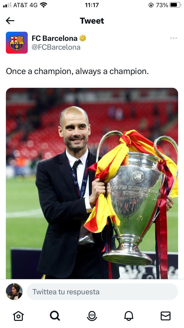 Now FC Barcelona sends an unexpected message to the coach after winning the Champions League. On its social networks, the club dedicated these words to Pep: "Once a champions, always a Champion". Several fans thought a possible return of Guardiola to the club but this is false.