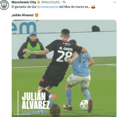 Manchester City announced that Julián Álvarez won the trophy for the best goal of the month of March. This recognition will go to the Argentine, a striker who is a world champion and who scored a great goal against Burnley in the FA Cup, although this player does not have the confidence of coach Pep Guardiola, the club's fans support him.