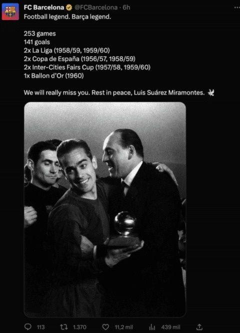 We are referring to Luis Suárez Miranda, a Spanish soccer player who lost his life at the age of 88. The same official communiqué from FC Barcelona left his deepest condolences to the figure of Suárez, as well as his earliest resignation. On the 9th he also had an important step at Inter Milan, where he played 256 games and scored 46 goals.