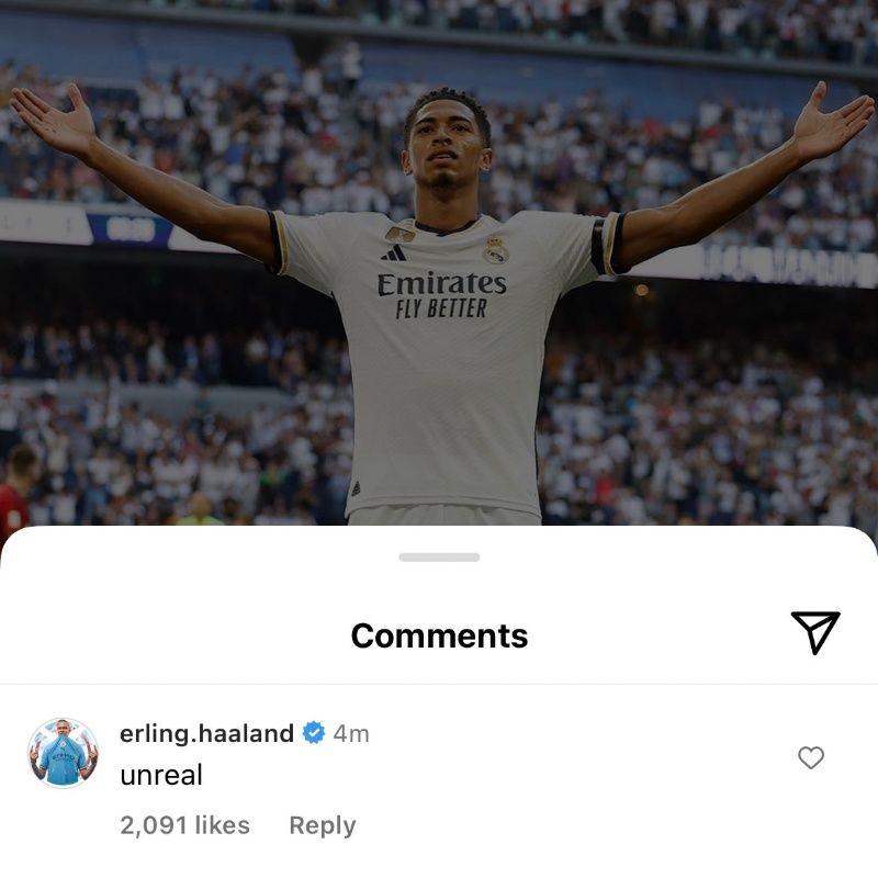 After the match, which Real Madrid won 4-0 against Osasuna, Jude Bellingham, who scored two goals today, uploaded a post to share with his followers on Instagram. In the post, club players congratulated him, as is customary, however, a comment from Erling Haaland appeared, where he praises the Englishman.