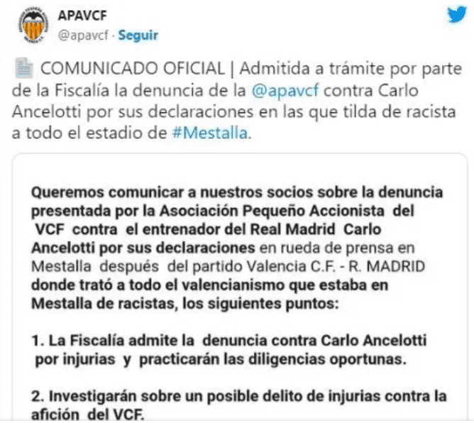 The newspaper Mundo Deportivo reported that coach Carlo Ancelotti was denounced by a Valencia Fans Association, this for the incident that Vinicius suffered at the Mestalla stadium where there were acts of racism.