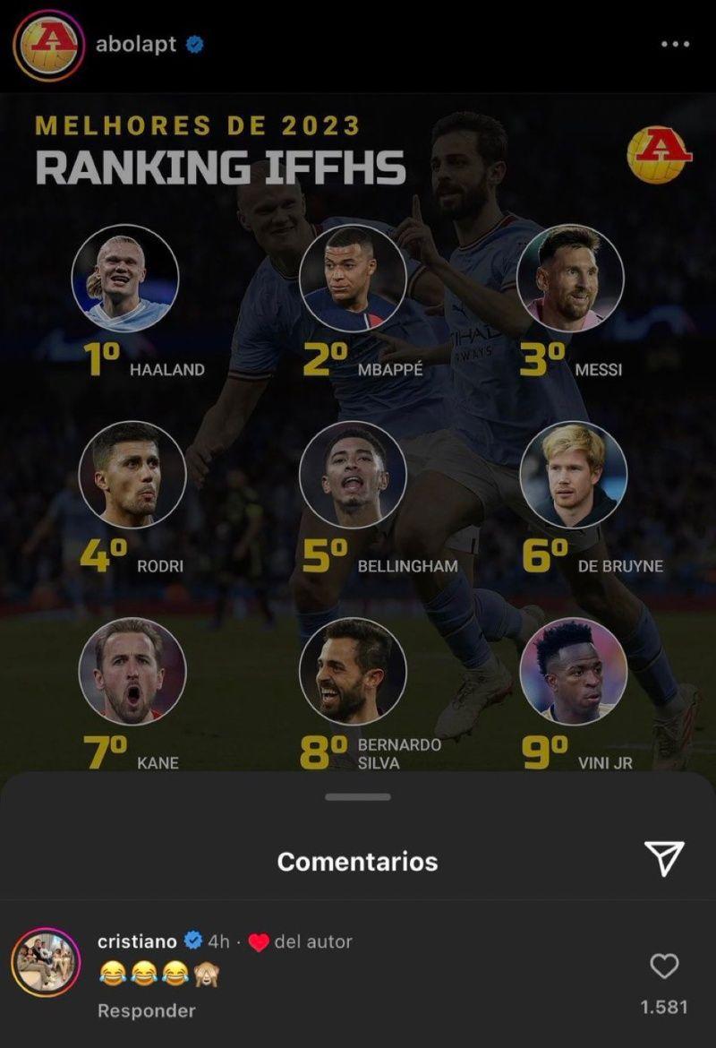 The newspaper A Bola de Portugal published a photo with the 2023 IFFHS ranking and the Al-Nassr forward was present in the comments with three laughing emojis and one of a monkey covering its face. This was clearly in reference to La Pulga's third place in the Top 10, as well as his absence. Now, it is worth mentioning that there is some reason in his complaint, since CR7 ended the year as the top scorer in the world.