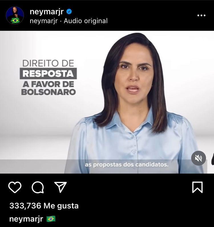 After the UEFA Champions League game, all the Paris Saint-Germain players uploaded several photos highlighting the team, and Neymar too, but he quickly returned to what interests him most, which is politics, and uploaded a video where he incites the people to vote for Bolsonaro.