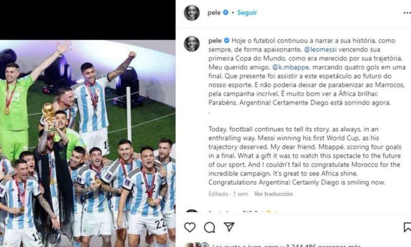 According to Pele, he was proud to see Messi lifting his first World Cup, as he deserved it. In addition, he was also happy for the great performance that Mbappe made during the great final after scoring three goals. To close, he confirmed that Diego Maradona must be smiling in heaven for the great work of Messi and future soccer prodigy Mbappe.