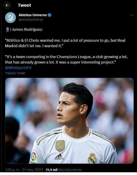 Beyond the firm intention of James Rodríguez, at Real Madrid they automatically gave up on the possibility and the Colombian attacking midfielder ended up going through the club's back door. According to his words, to this day he regrets having lost the opportunity to be part of Cholo's project.