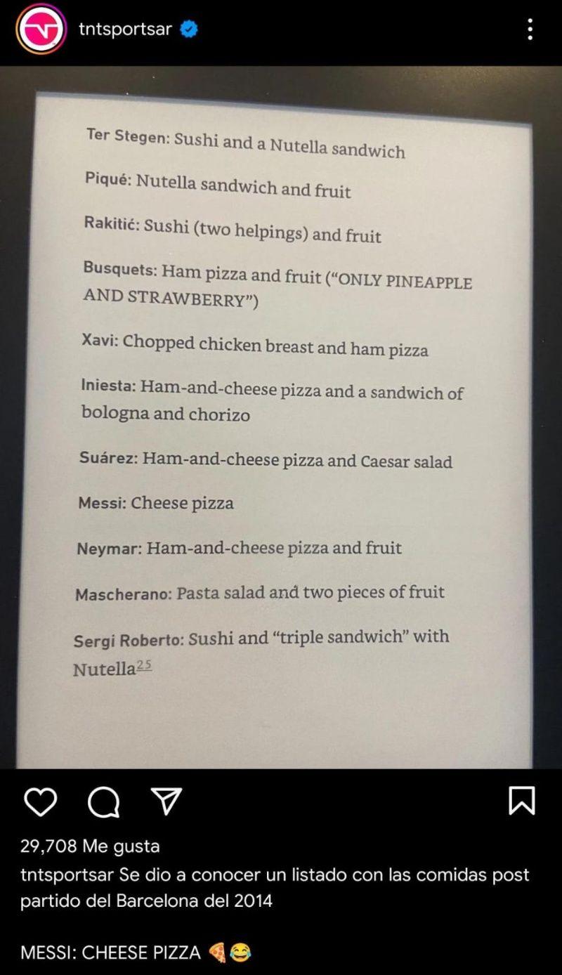 On social media, TNT SPORTS posted an image of what appears to be the food order for each player at FC Barcelona. With this said, the image has gone viral. In the image, you can see names such as Neymar, Iniesta, Busquets, Piqué, among others. Now, what is striking is that while Ronaldo is disciplined and eats healthy, Lionel Messi, being a professional athlete, prefers to have cheese pizza for dinner. Undoubtedly, a very curious moment