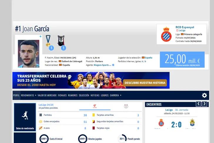 Joan García, 24 years old, has established himself as one of the most promising goalkeepers in Spanish football. His performance at Espanyol, despite the league they're in, has not gone unnoticed by Europe's top clubs. Barcelona, who has been following him closely for some time, has decided that he is the chosen one for the generational change in goal.