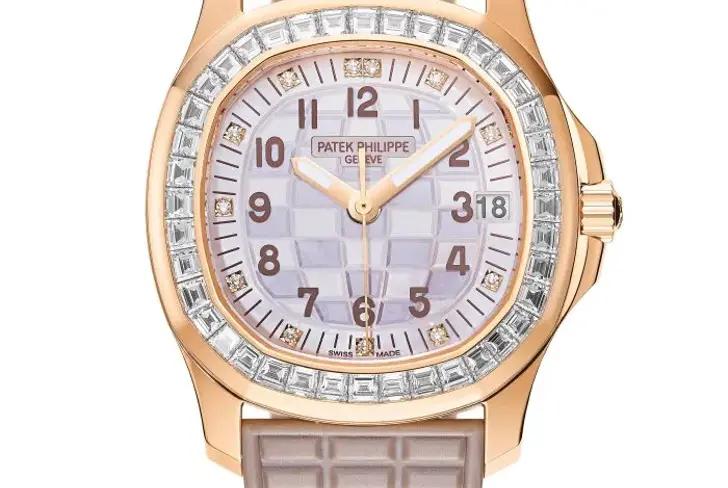 Victoria opted for a Patek Philippe Aquanaut (reference 5072R), exuding sophistication and femininity. Crafted in rose gold, the watch features a checkerboard beige mother-of-pearl dial with gold hour markers painted in brown. Its bezel is adorned with 40 baguette-cut diamonds, complemented by 10 additional diamonds on the folding clasp.