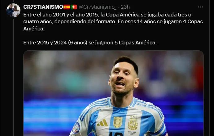 The frequency with which the Copa América have been organized in recent years has also been the subject of analysis. Between 2015 and 2024, five editions of this tournament were held, an unusually high number. In addition, the choice of Miami as the venue for the 2024 Copa América final, coinciding with Messi's arrival at Inter Miami, has raised suspicions about possible strategic planning to favor the Argentine player.