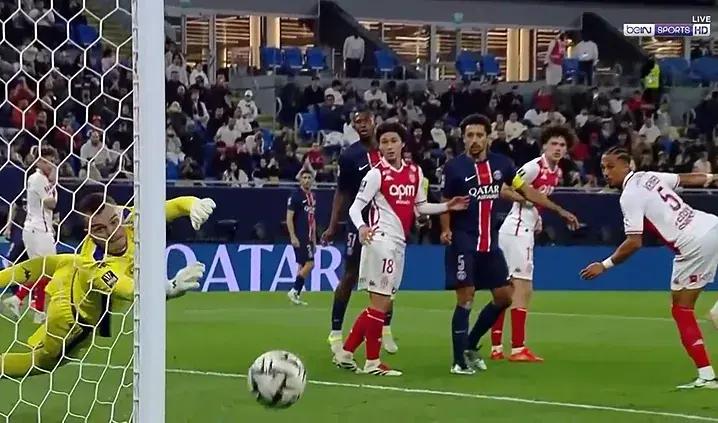 Uuuuuy Monaco . Another great approach from the Monegasque team, Minamino and Akliouche combine inside and the latter's shot is well blocked by Marquinhos who throws himself to the ground.