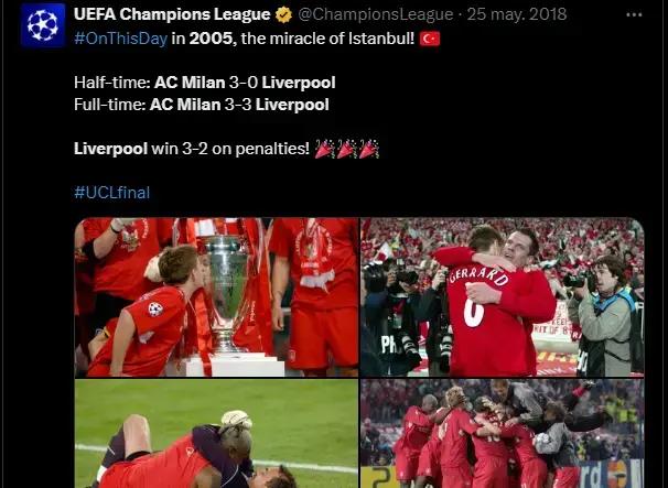 The ensuing penalty shootout saw Milan's Serginho blaze his shot over the bar, and Andrea Pirlo's attempt was saved by Jerzy Dudek. Liverpool converted their first two penalties, while Milan managed only one successful attempt. With the score at 3-2 in Liverpool's favor, Dudek denied Andriy Shevchenko, clinching Liverpool's fifth European Cup in a match forever known as the "Miracle of Istanbul."