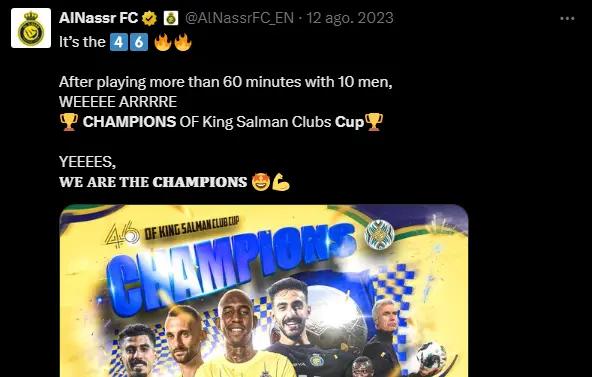 Beyond individual accolades, Ronaldo played a pivotal role in Al-Nassr's triumph in the Arab Club Champions Cup on August 12, 2023. He scored both goals in the 2–1 victory against Al-Hilal in the final, securing his first trophy with the club and demonstrating his impact on the team's success.