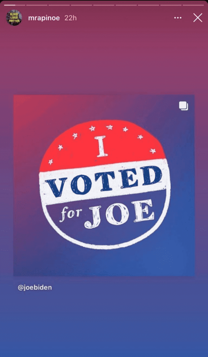 For this reason, Rapinoe shared many massages and images on her social media calling people out to vote for Joe Biden. Yesterday wasn't the exception. He published an imagen calling everybody to vote early in the morning and later she shared an Instagram story of Joe Biden where a pin was seen and it said: "I vote for Joe".