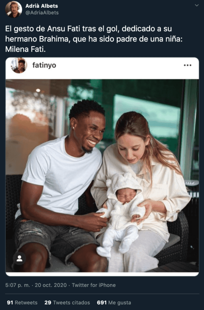 But the truth was later cleared by Catalan journalist Adriá Albets, who posted on his Twitter account the information that Ansu Fati's brother, Brahima, has recently became father. Ansu's niece is called Milena and was borned in Spain, the same country that Fati will represent for the rest of his life. Barcelona fans, you can relax: Ansu Fati is not expecting a baby yet.