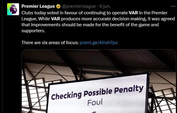 In June 2024, Premier League clubs voted on the future of VAR. Although Wolverhampton Wanderers proposed its removal, the motion was rejected by a 19-1 vote in favor of retaining it. This decision reflects recognition of VAR's benefits alongside an understanding of the need for continuous improvement.