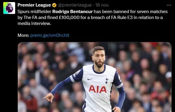 In November 2024, Rodrigo Bentancur, a midfielder for Tottenham Hotspur, was suspended for seven matches for making a racist comment about his teammate Son Heung-Min. During an interview, Bentancur made a derogatory remark about Son's nationality, leading the Football Association (FA) to impose the suspension, reinforcing its commitment to combating racism in football.