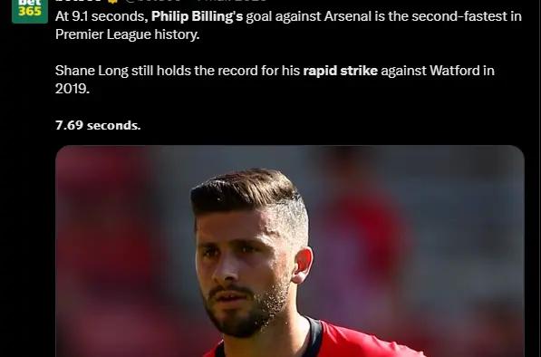 Philip Billing of Bournemouth stunned the Emirates Stadium on March 4, 2023, by scoring against Arsenal just 9.11 seconds into the match. This goal became the second-fastest in Premier League history, showcasing Billing's alertness and Bournemouth's tactical preparedness.