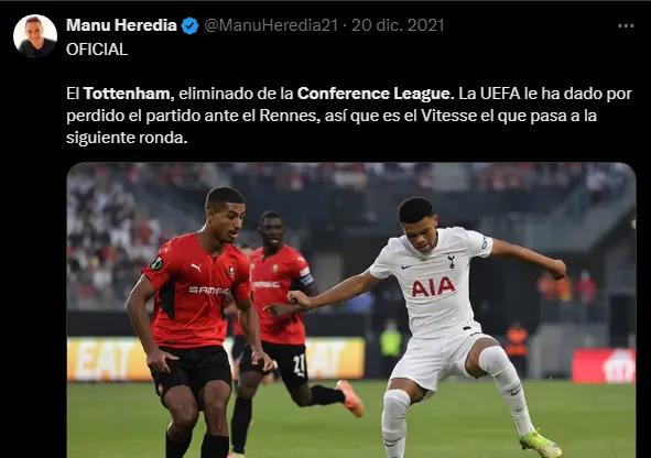 Due to a COVID-19 outbreak, their decisive match against Rennes was canceled, leading to UEFA awarding Rennes a 3–0 win, eliminating Spurs from the group stage.