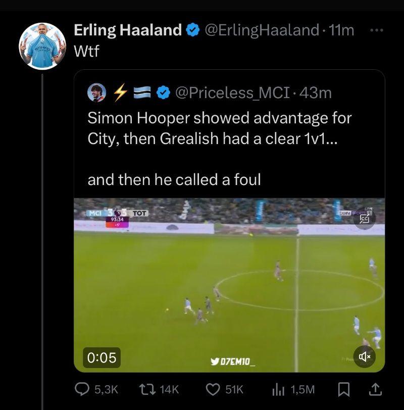 Erling Haaland was apoplectic after Manchester City were held to a 3-3 draw with Tottenham Hotspur. In the dying embers, referee Simon Hooper controversially refused to play the advantage which could have resulted in a late Jack Grealish winner. Haaland had done well to turn on the halfway line, riding a reckless lunge from Emerson Royal. The Norwegian striker then threaded Grealish through, with the referee initially waving play on. City seemed destined to have a clear one-on-one with Guglielmo Vicario until play was halted for the foul on Haaland.