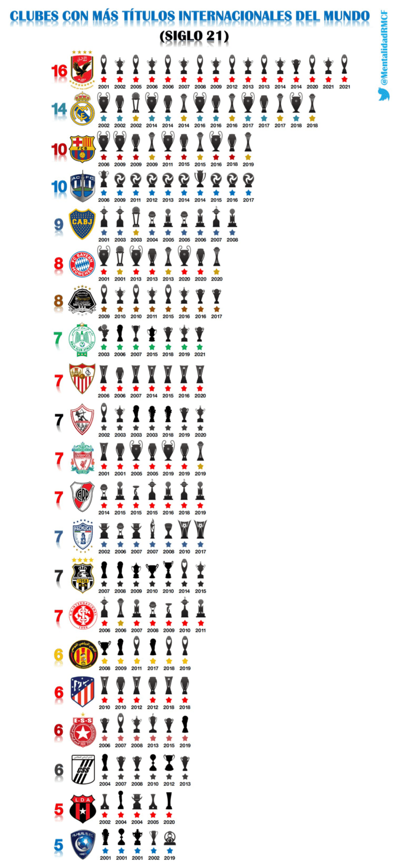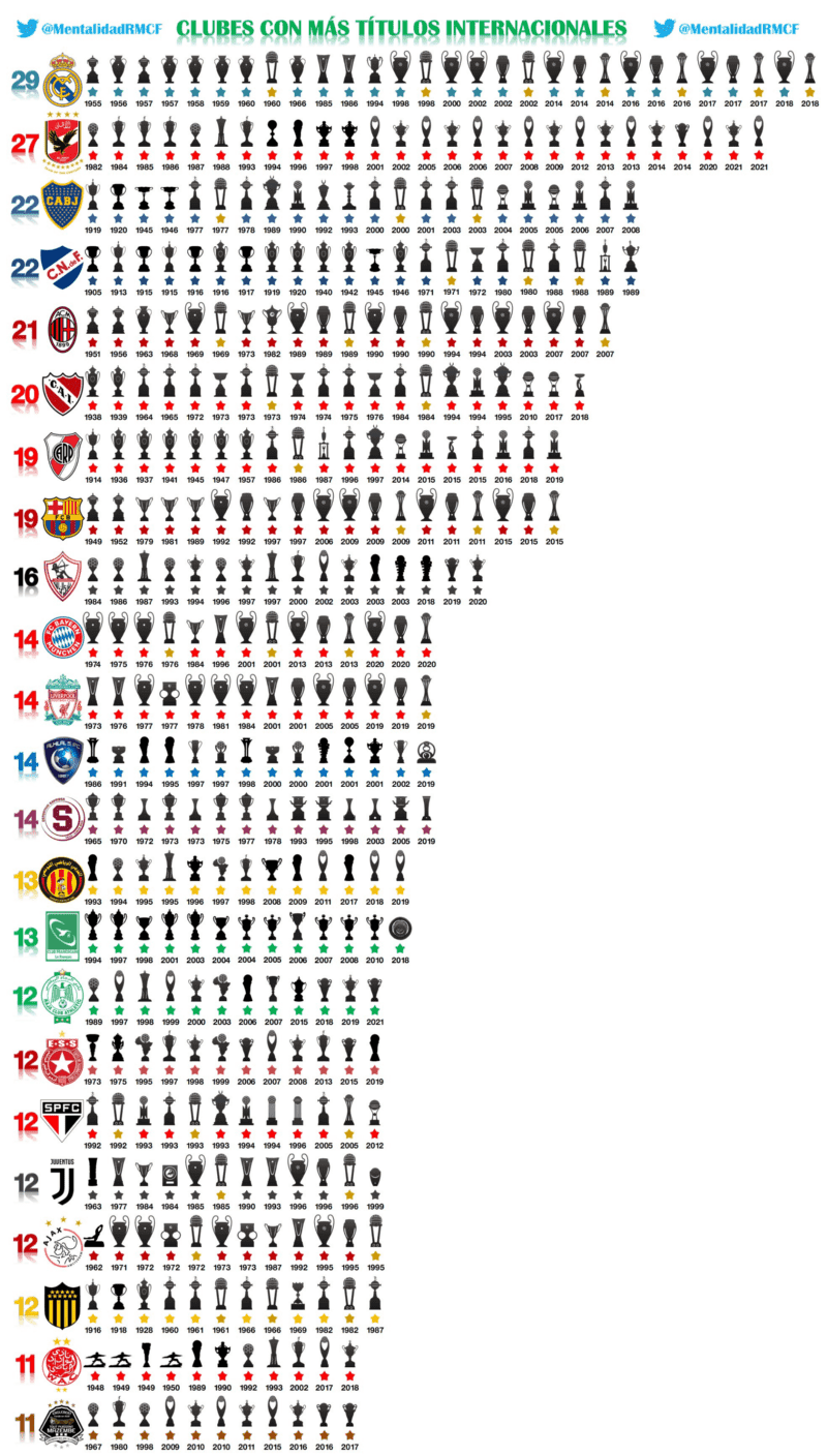 Its ten stars are double those achieved by its close rivals, such as Zamalek (Egypt) and TP Mazembe (Congo), both with 5. Among other particular data of this club, Al-Ahly was only one trophy away from reaching Real Madrid in current international titles. In addition, as reported by the user ‘RMCF Identity’ on Twitter, the Egyptian team is the team with the most official international titles of the 21st century, winning 16 (2 more than Real Madrid).