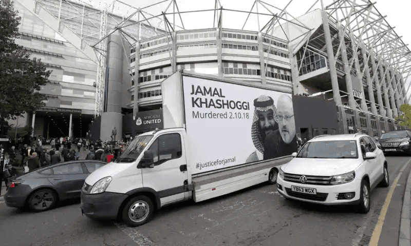A truck drove around Saint James Park with a sign bearing the name of Jamal Khashoggi, a journalist murdered at the Saudi Arabian Embassy in Turkey in October 2018. In addition to having the causes and date of death, the banner also had the hashtag #JusticeForJamal.